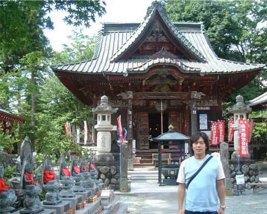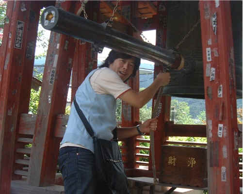 札所一番で鐘を突く宮本。