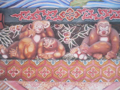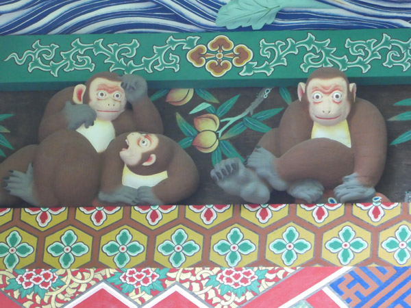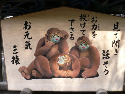 小さな3匹の猿の彫刻があるのですが、日光東照宮の3猿の見ざる言わざる聞かざるに対し