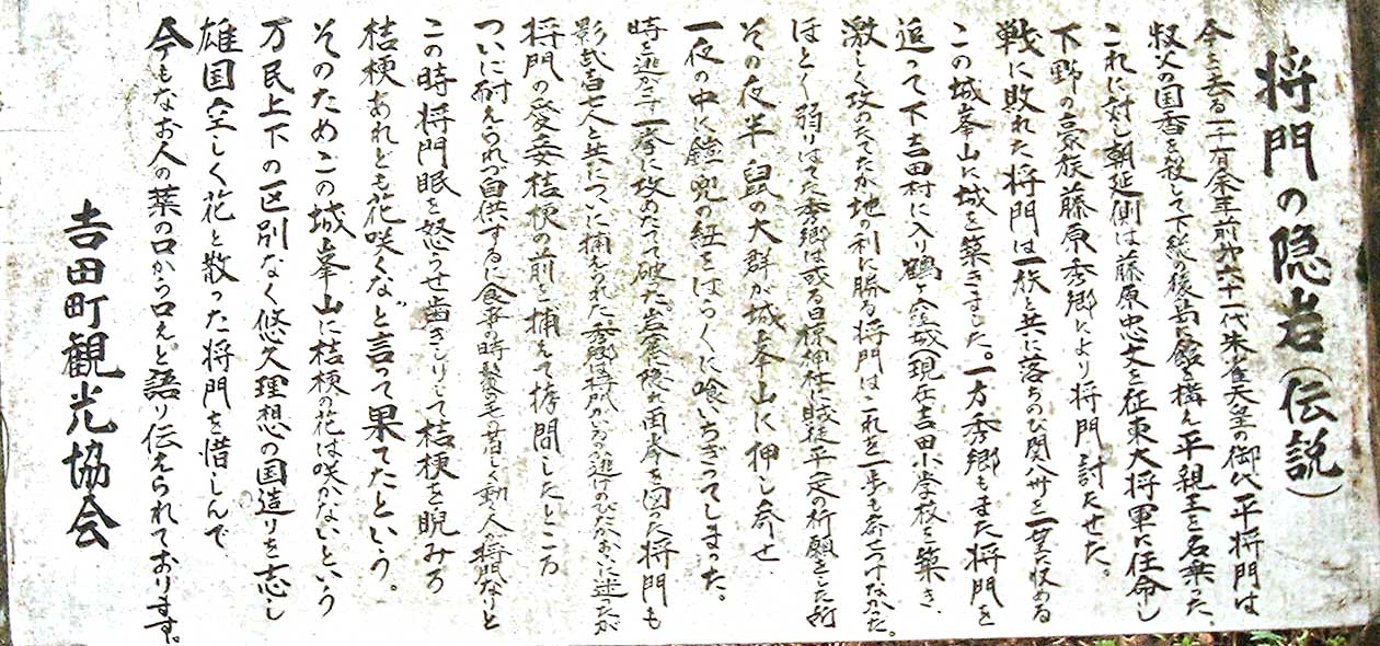 城峯山で平将門が討ち取られたという伝説があります。影武者が7人いたとか。
